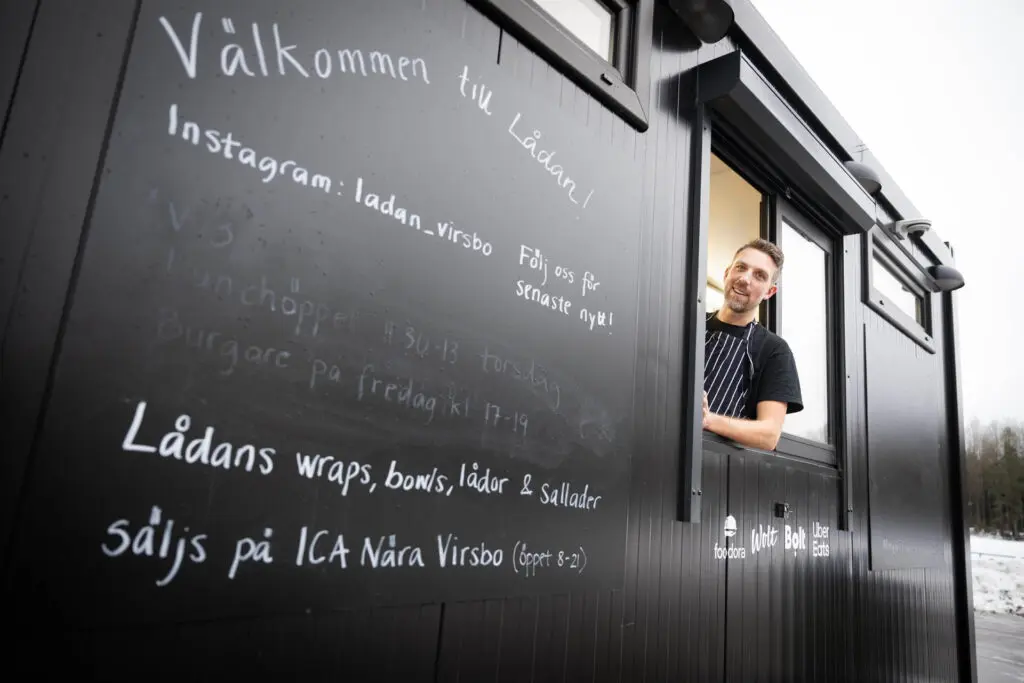 När han såg en annons om en nybyggd kökscontainer till salu föll bitarna på plats. Johan köpte containern som placerades vid idrottsplatsen i Virsbo. Företaget Lådan var fött, och här lagar Johan matlådor till företag och den lokala ICA-butiken, han har cateringverksamhet och ibland öppnar han luckan och serverar hamburgare. Då ringlar kön långt in på fotbollsplanen.